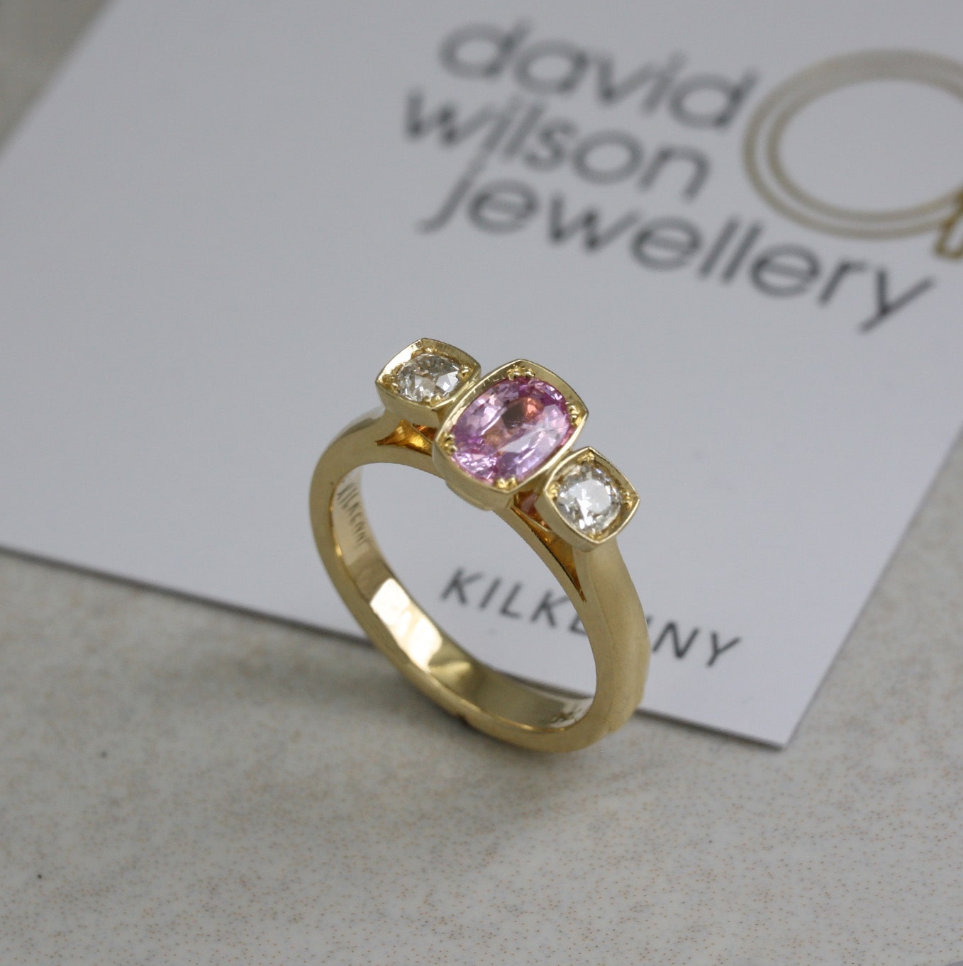 A 0.83ct oval pink sapphire measuring 4.75 x 6.75mm, two old-cut diamonds and luxurious 18 carat gold come together to create this beauty. Completely handmade in our studio in Killkenny.