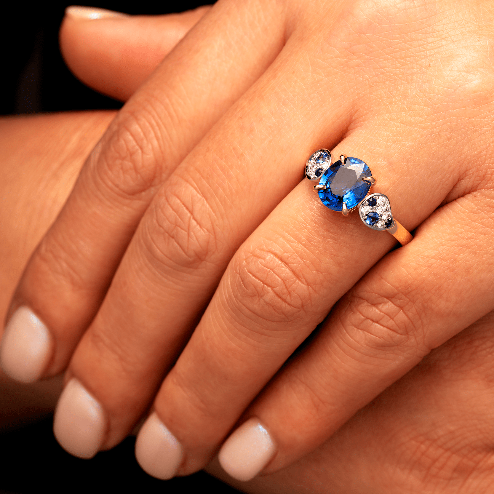 A truly stunning sapphire brings the wow factor to this ring. A 2.2 carat oval sapphire measuring 9 x 7.5mm set in 18ct gold, accented with smaller sapphires and brilliant-cut natural diamonds pavé-set in platinum. Total diamond weight 0.12 carats. Designed and completely handmade in our Kilkenny city-centre studio.