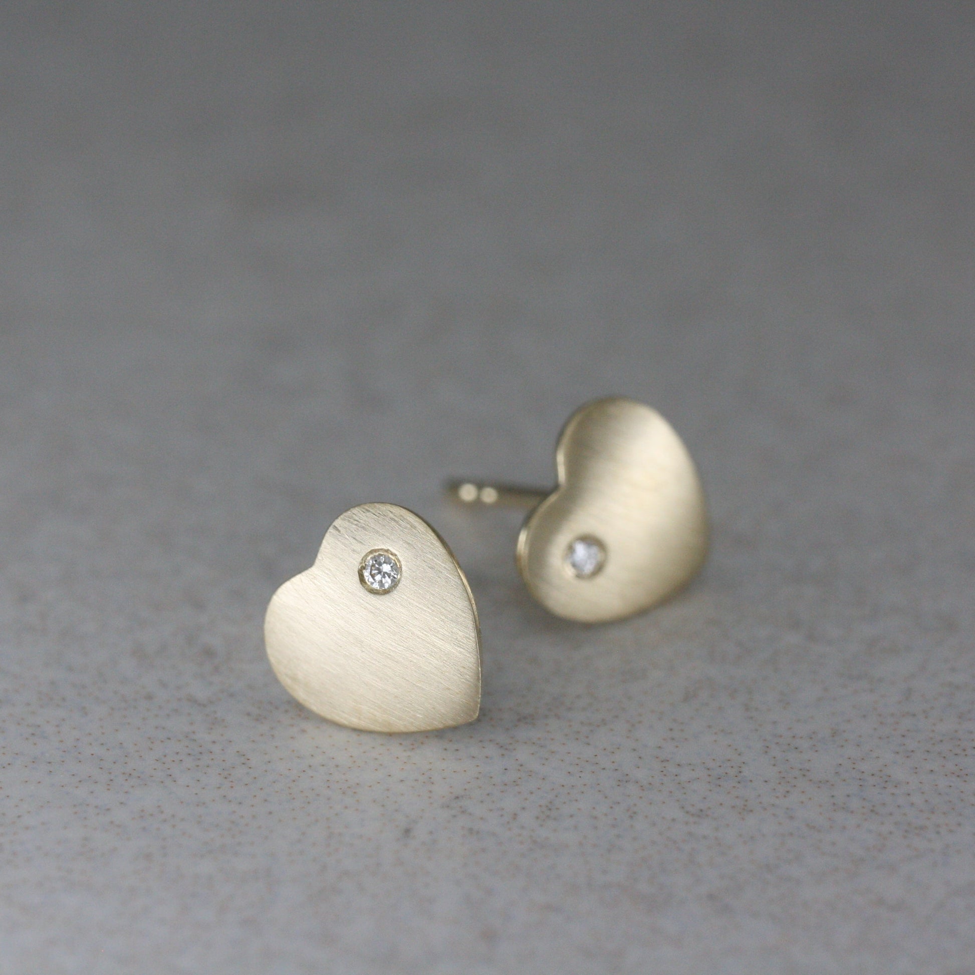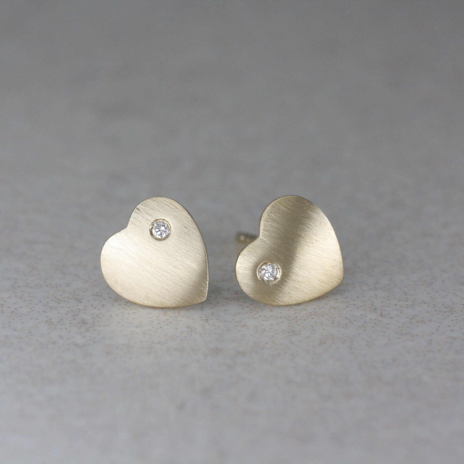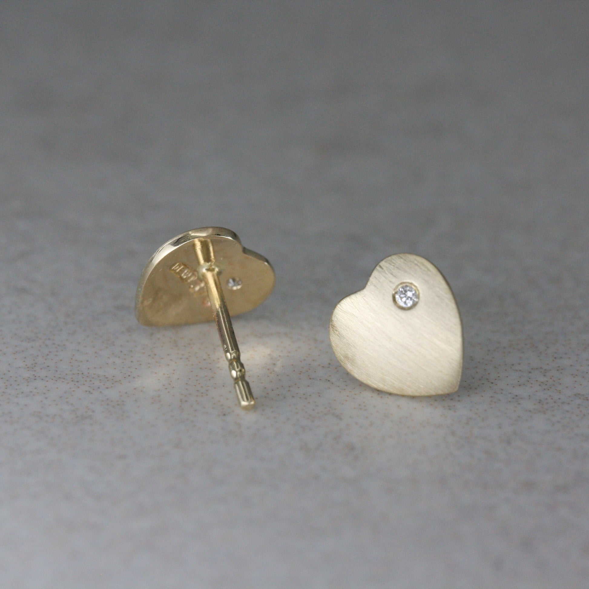 Gorgeous 9ct gold matte love-heart ear studs, set with a single brilliant cut diamond and a matte finish, perfect for any age.